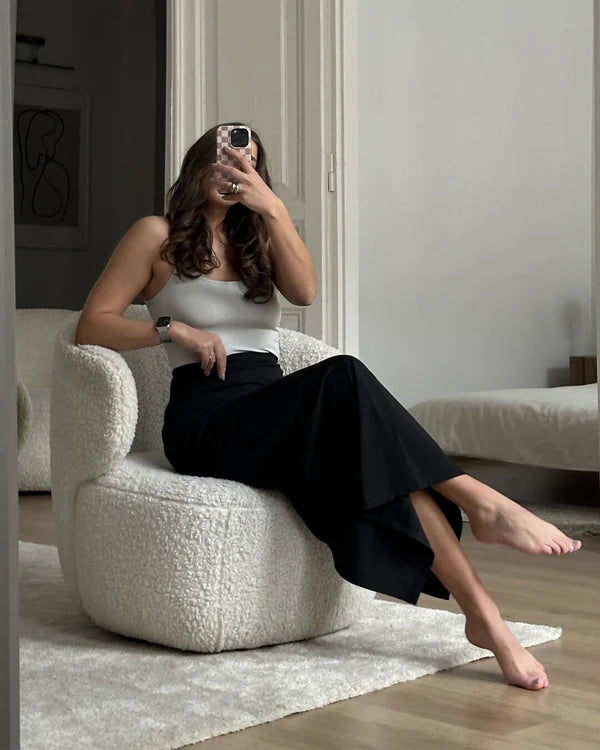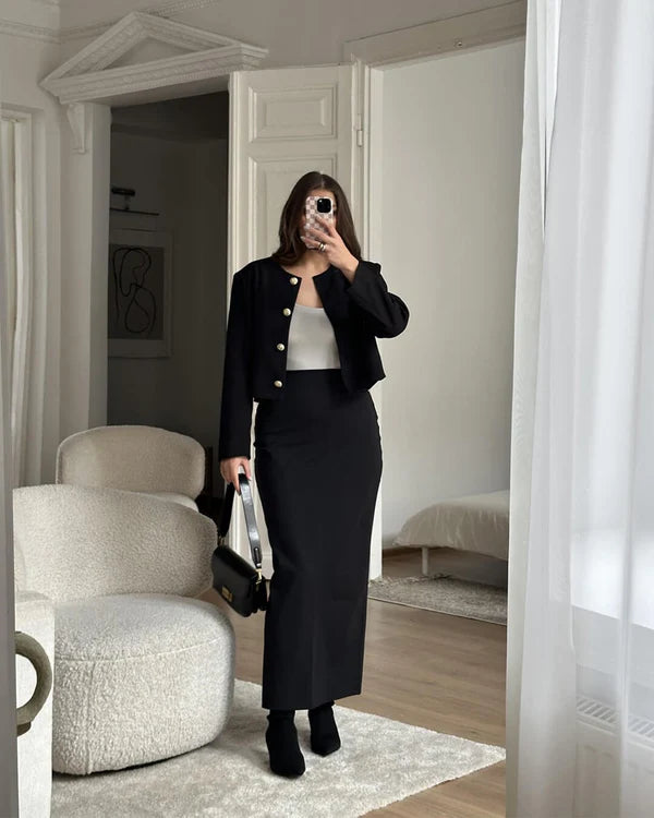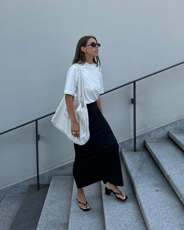 This is a fitted pencil-fit maxi skirt that is designed to be full length. Size up if you want a slightly less hugging sensation.