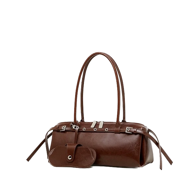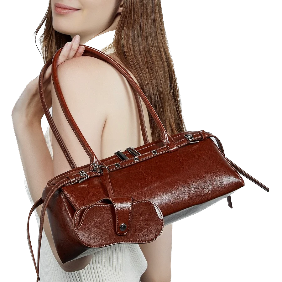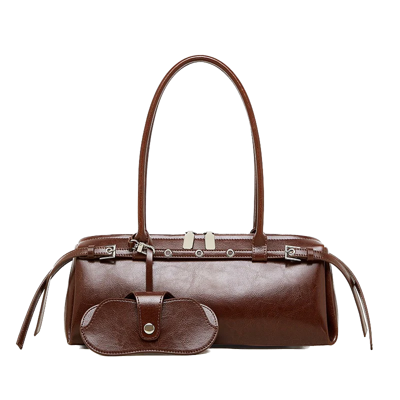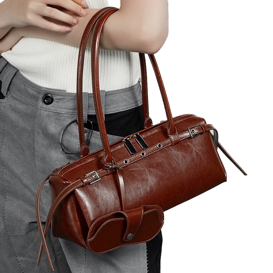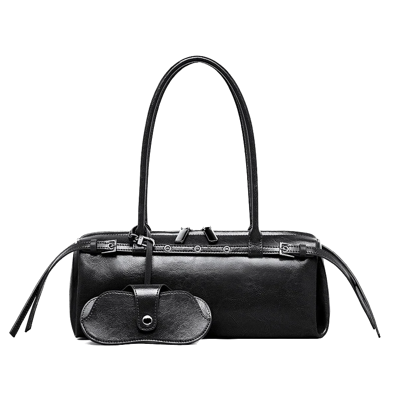 Şehir estetiğini asi bir zarafetle buluşturan bu hakiki deri omuz çantası, cesur motosiklet esintili kemer detaylarıyla güçlü bir stil ifadesi yaratır. Orta boy, yatay ve yapılandırılmış silueti; modern, kararlı ve sofistike bir duruş sunarken kaliteden ödün vermeden tasarlanmıştır.
